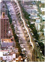 在神户,道路的毁坏(如图中这条高速公路)阻碍了急救工作的进行。供水主管道的毁坏使消防设施在许多地区不能使用。