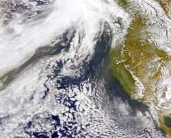 1998 年 4 月 15 日下午到夜间,内蒙古西部和中部、甘肃、宁夏、陕北、山西等地出现了沙尘暴天气。这些地区被卷到空中的沙尘,在高空西北气流的引导下,向东南方向扩散。这次来自西北和内蒙古地区的沙尘暴,从 16 日起,使华北中部到长江中下游以北大部分地区先后出现了浮尘天气。17 日 08 时天气实况资料显示,浮尘已达江汉平原和江南中东部,武汉、南京、上海、杭州等地都报告了天空呈土黄色。这次沙尘暴还"漂洋过海",在 17 日 08 时地面天气图上,韩国济州岛和日本九州等地都标上浮尘天气符号。更令人吃惊的是,气流裹着沙尘竟然漂过太平洋一直吹到了美国西海岸的加州。 ![]() 1998年4月16日,棕黄色的黄云在锋面的推动下到了中国的黄海海岸线。4月20-24日在低压大气环流的带动下沙尘飞跃到了北太平洋。4月25日,沙尘到过达了美国西海岸。 在对沙尘的扩散力惊叹之余,更令人意想不到的是,沙尘暴与全球的温室效应也有关系!大气温度不同的时间呈现出一种波动。不知什么原因,在较冷的时期,地球沙漠地区的风会变大,因此有更多的沙尘落入海中。沙尘来源于沙化土地表层,以撒哈拉沙漠为例,每年该地区要向外输出6000万-2亿吨沙尘。沙尘含有许多营养物质,其中的铁正是海洋中所缺少的营养元素。海水中增加的营养物质导致其中的藻类大量繁殖。这些增加的藻类光合作用要吸收更多的二氧化碳,而二氧化碳这种温室气体的减少又使得地球的温度进一步降低,并且沙尘直接屏蔽太阳幅射,从而使地球的冷期沿长。接照这种推断,陆地和海洋的这种互动模式对于大气影响将导致地球的温室效应的减小,如果没有其它因素打破这种反馈性的降温,地球的"冰期"的就不久远。 在夏威夷群岛的一项自80年代的以来对海洋的连续测试表明98年4 月的这次沙尘暴使该地区海域的蓝藻数量大幅度地增加,进一步说明了这种推测的正确性。 此外,研究表明来自撒哈拉的沙尘也是中美和南美热带雨林的重要营养来源。 目前,人类的能力还不足以可以控制大气的水平,但是人类的活动却可以对大气产生很有力的影响。在我们对我们所生活的环境完全明白之前,我们在中国所破坏的环境已以影响到地球另一端的南美热带雨林和海洋。 1998年4 月的发生于中国和蒙古的一次沙尘暴一直影响到大洋彼岸的美国。尽管撒哈拉沙漠常常含不吝啬跨跃大西洋把它的尘土抛向美国,但来自亚洲的沙尘影响美洲大陆却是稀罕事。此图显示了在这次沙尘暴发生过程中全球气溶胶指数发生的变化(其中还有4月底墨西哥丛林大火的影响)。